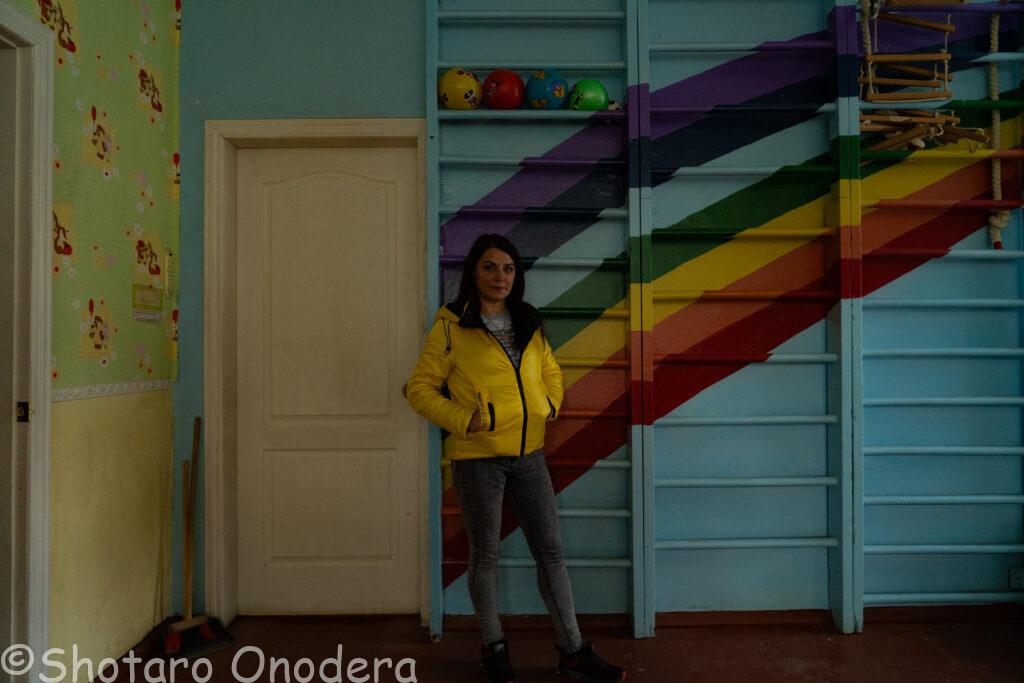 写真、カーチャの母アンナ、背景はアンナの勤務する幼稚園