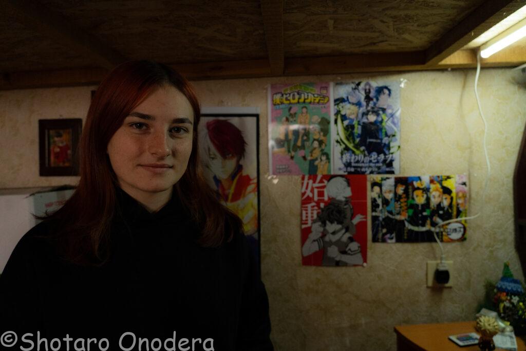 鬼滅の刃、僕のヒーローアカデミアが大好きな、16歳の少女カーチャ。背景は自宅に貼られた日本のアニメのポスター